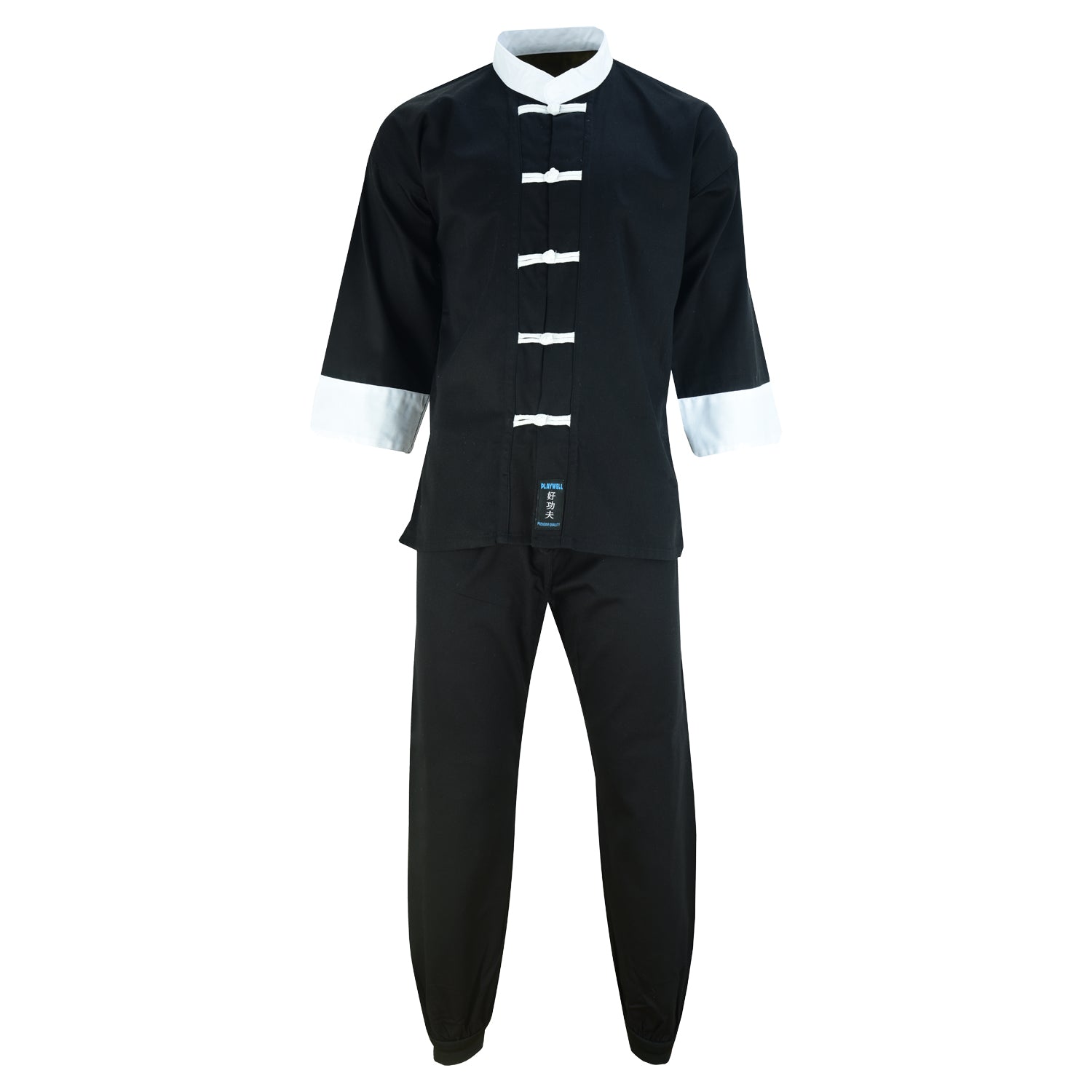 New Elite Ultra Light Microfibre Kung Fu Uniforms, So Light You want even Feel you have this on, All Black Colour. White Cuffs and Toggle Fasteners to Jackets.Kung Fu Trousers with Elastic and Cord Waist and Elasticated Ankle for all sizes. Traditional outfit.