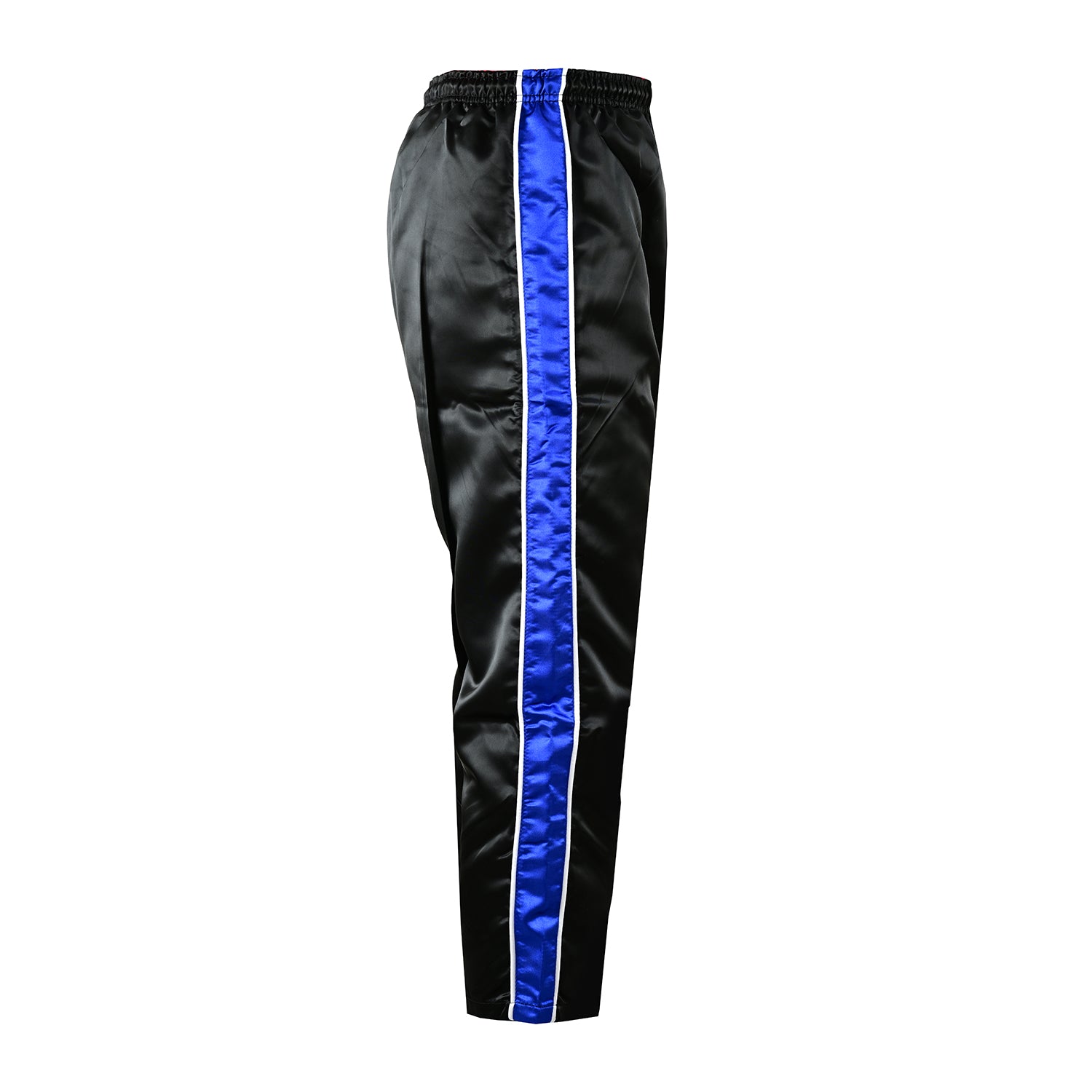 Full Contact Trousers Competition Grade, Made of 100% Lightweight Satin. Suitable for All styles of Martial Arts. With Elasticated Waistband. Trousers Are all Black , With Single Blue Stripe