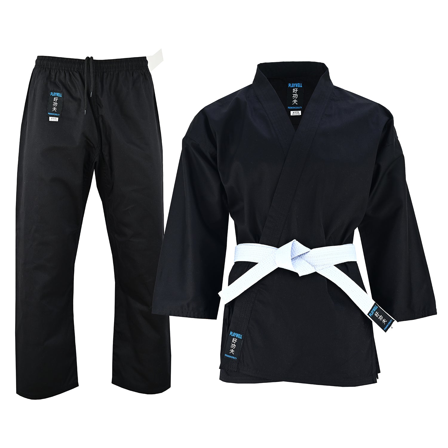 Playwell's Kids Karate Cotton Suit Black made of 100% cotton. Medium Weight. 8.5oz Fabric, Top quality and designed for comfort fit to give you a greater range of movement. There is no other match to Playwell Uniforms.