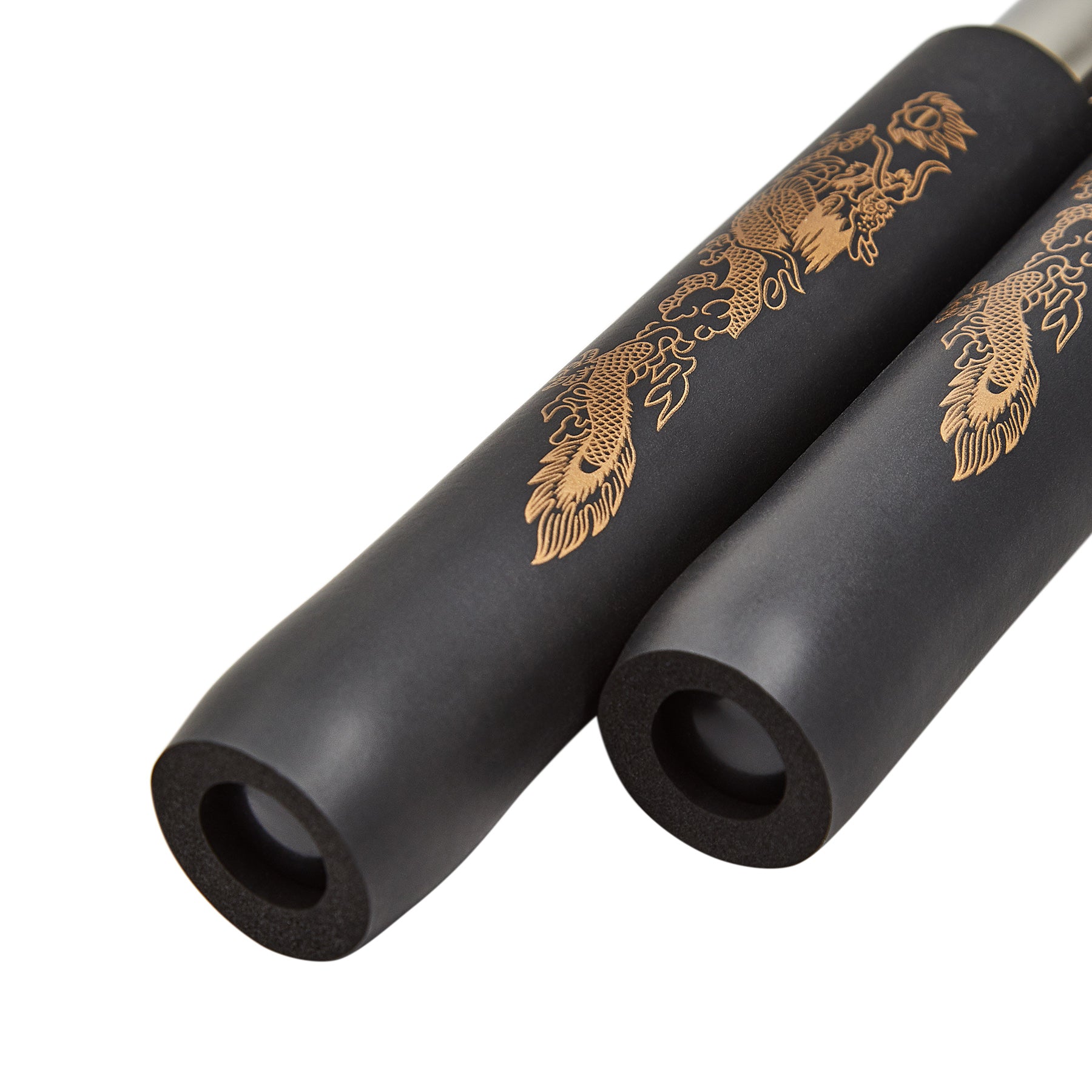 Foam Nunchucks for children All Black with Dragon Design Nunchucks made of foam With Metal Ball Bearing Chain. Diameter of Handles approx 1.2 inches, Length of Handles 8inches, Length of Chain approx 5.5 inches (7 links in chain). Great For Beginners, Children, Ladies Available With Metal Chain Or Cord.