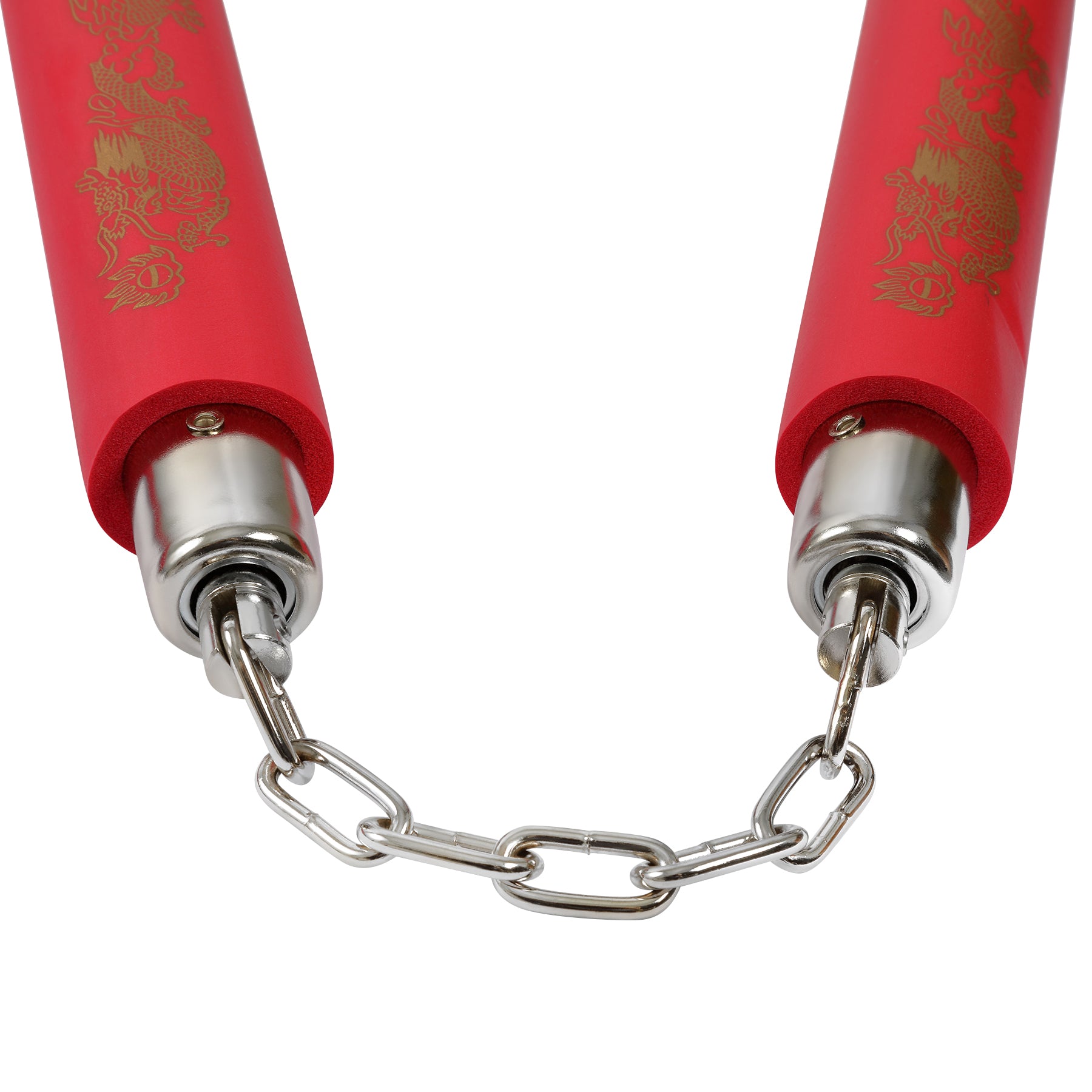 Foam Nunchucks for children All Red with Dragon Design Nunchucks made of foam With Metal Ball Bearing Chain. Diameter of Handles approx 1.2 inches, Length of Handles 8inches, Length of Chain approx 5.5 inches (7 links in chain). Great For Beginners, Children, Ladies Available With Metal Chain Or Cord. Colours Subject to Availability. ....................Best Seller As a Measure of safety and law why not store your Nunchaku in our deluxe nunchaku cases...................