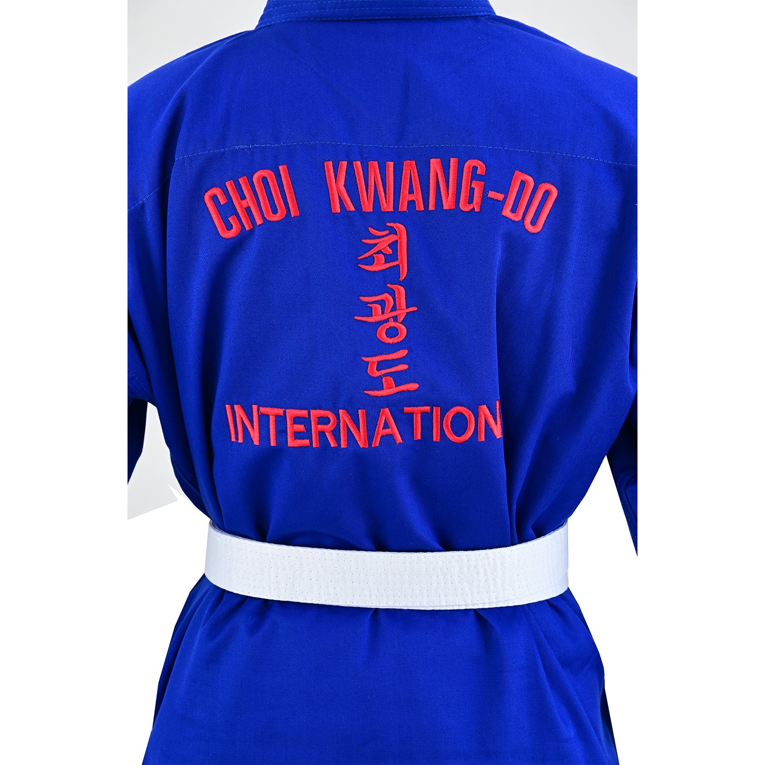 Blue Choi Kwang Do Uniform. Made from Polycotton. 65% Poly, 35% Cotton. With Full Choi Kwang Do Embroidery on the Back of the uniform, Complete with official Choi and Pil Sung Badge on the Front of the Jacket. Comes Complete with Elasticated Waist Trousers.