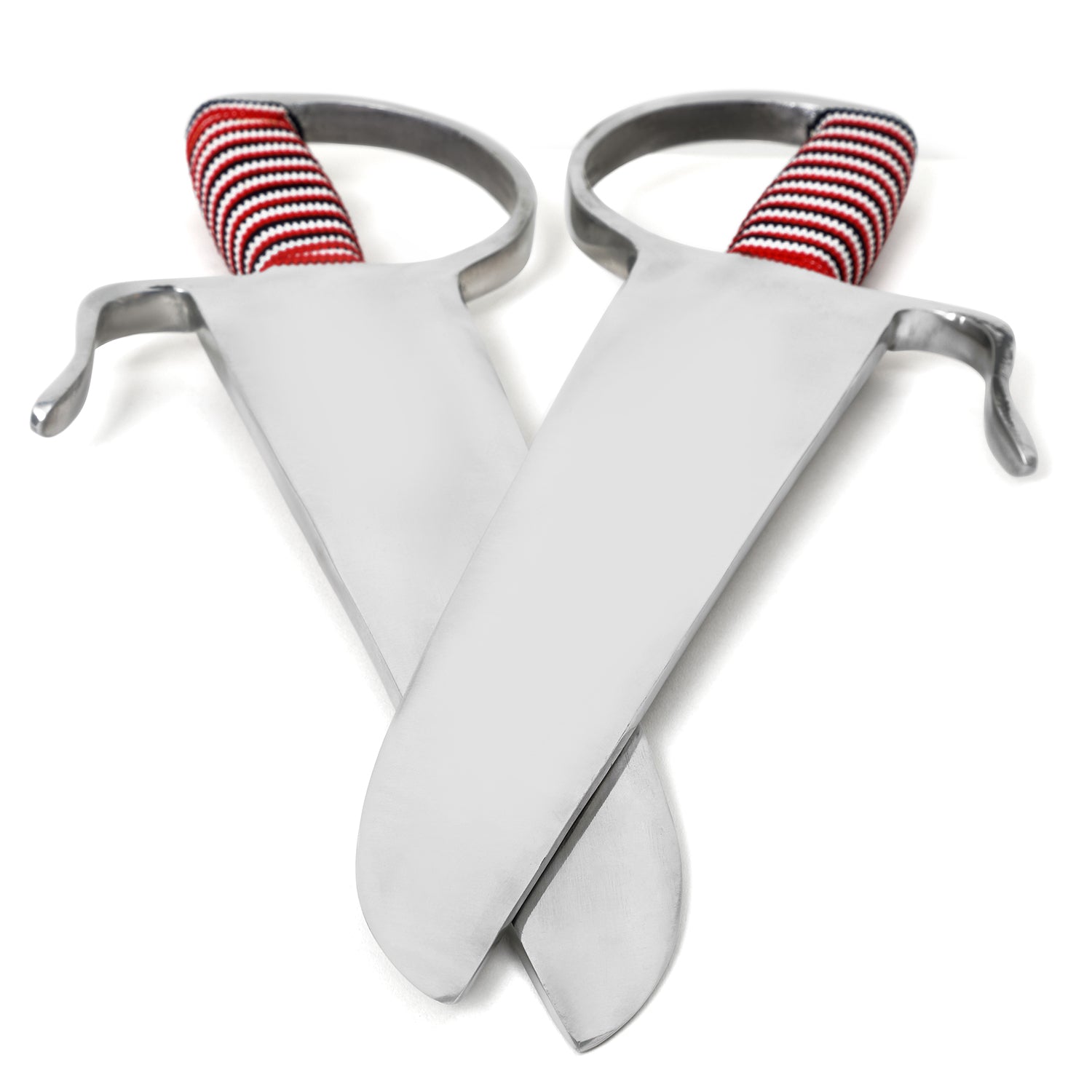 Made of tough Aluminium. Length of handle approx 4 inches. Blade length approx 12. Total length of wing chun knife 16 inches. Distance between the loops approx 1.3 inches. Sold in Pairs. Weight 960g ( Total weight of pairs )